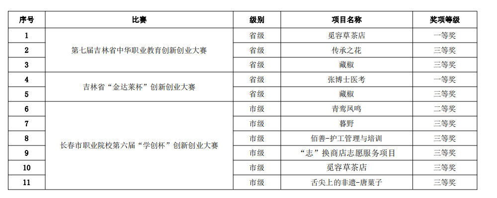 2023年12月,在第七届吉林省中华职业教育创新创业大赛决赛中,《觅容草茶店》项目荣获中职组一等奖,《传承之花》、《藏椒》两项项目荣获高职组三等奖;在吉林省人力资源和社会保障厅主办的吉林省“金达莱杯”创新创业大赛中,我校经过层层角逐,最终夺得2项奖项,其中一等奖1项,三等奖1项;在长春市职业院校第六届“学创杯”创新创业大赛决赛中获得奖项6项,其中二等奖1项,三等奖5项。