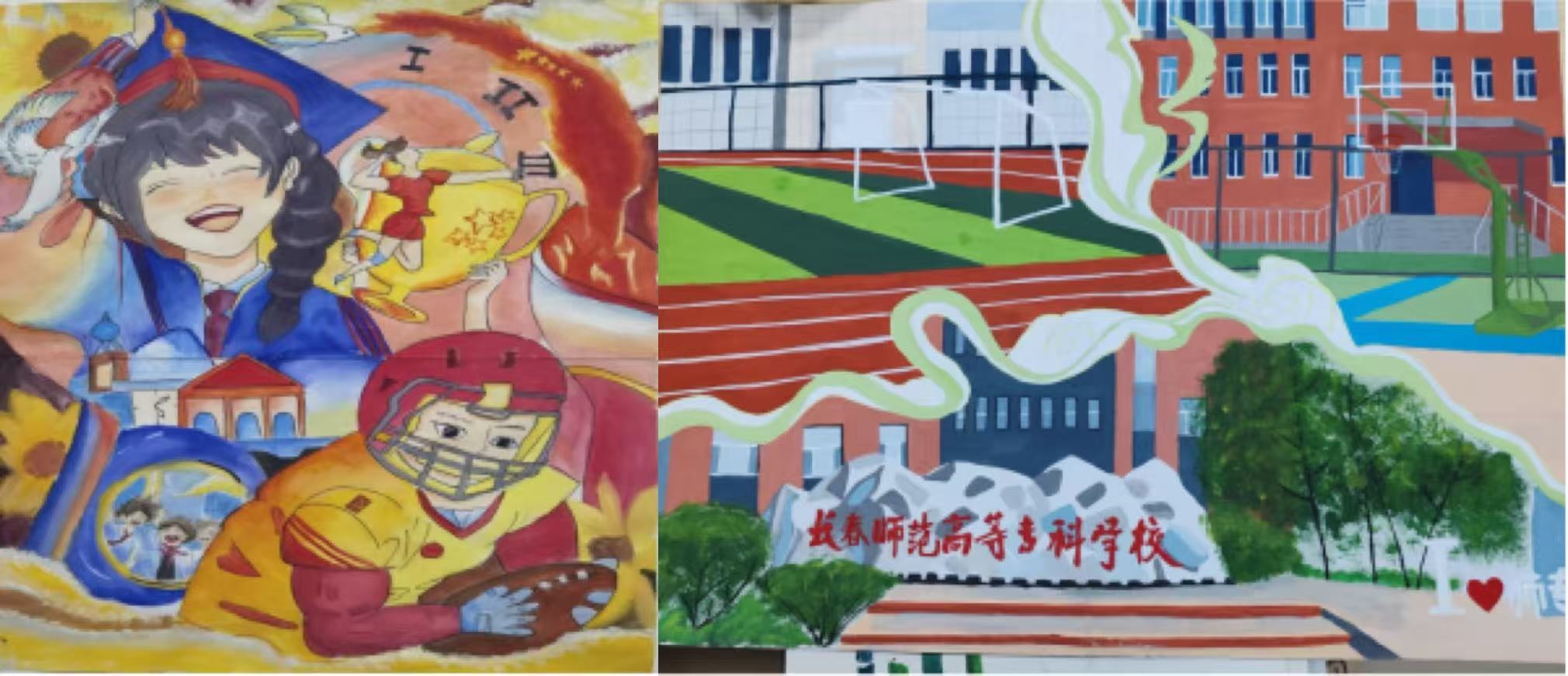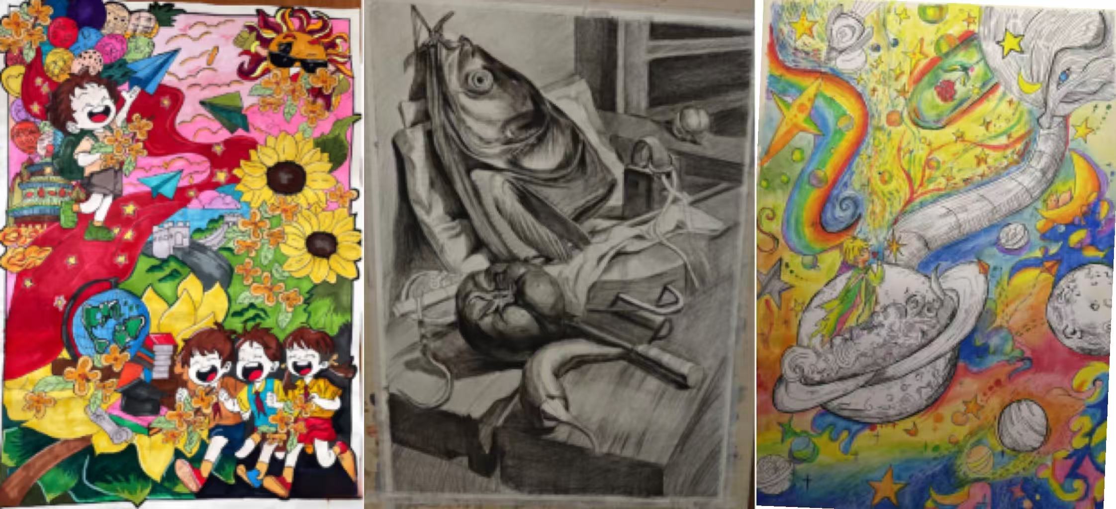 绘画赛道设置水粉画,马克笔画,油画棒画,国画,彩铅画,选手们以画笔为媒,定格美好瞬间。素描组选手用黑白灰阶勾勒《校园一隅》,教学楼的几何线条与光影交错尽显功底;水彩组作品《春日集市》以湿润笔触晕染出市集的烟火气息;漫画组选手则以《未来幼师》为题,用分镜叙事展现幼教人的温暖日常。值得一提的是,本次大赛增设“教育场景创作”专项,多幅作品将二十四节气、传统童谣融入画面,彰显学前教育专业特色。